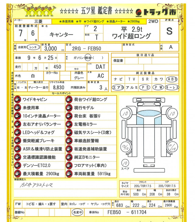 ★平★ワイド超ロング★現行モデル★未使用車★左右アオリバランサー★左電格ミラー★LEDヘッド&フォグ★磁気サスシート(D席)★衝突軽減ブレーキ★坂道発進補助装置★交通標識認識機能★純正Bモニター★デンソーETC2.0★フロアマット(車内)★