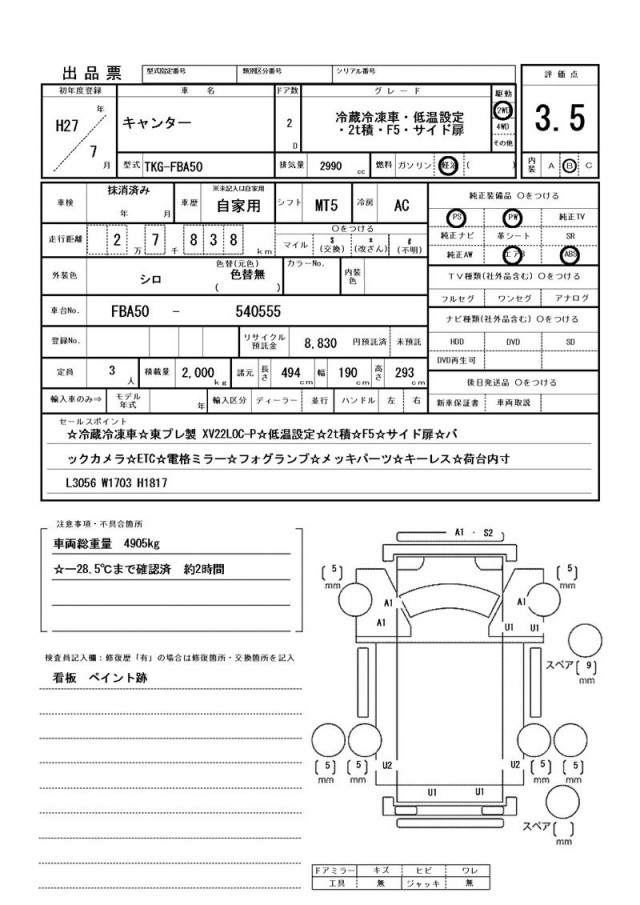 ☆冷蔵冷凍車☆東プレ製 XV22LOC-P☆低温設定☆2t積☆F5☆サイド扉☆バックカメラ☆ETC☆電格ミラー☆フォグランプ☆メッキパーツ☆キーレス☆荷台内寸 L3056 W1703 H1817 ☆ー28.5℃まで確認済 約2時間