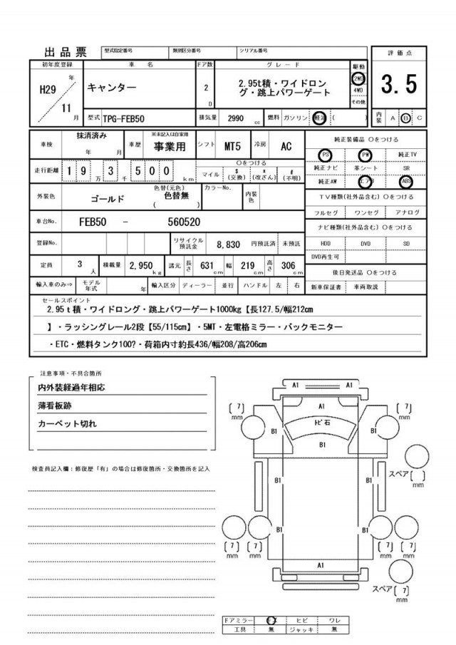 2.95t積・ワイドロング・跳上パワーゲート1000㎏【長127.5/幅212㎝】・ラッシングレール2段【55/115㎝】・5MT・左電格ミラー・バックモニター・ETC・燃料タンク100ℓ・荷箱内寸約長436/幅208/高206㎝