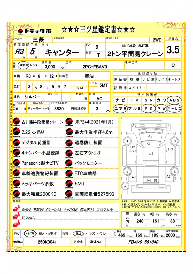 2トン平簡易クレーン UNIC4段クレーン 2.22トン吊り アウトリガー 過巻防止装置 衝突軽減ブレーキ 車線逸脱警報 ナビTV バックモニター ETC キーレス 5MT