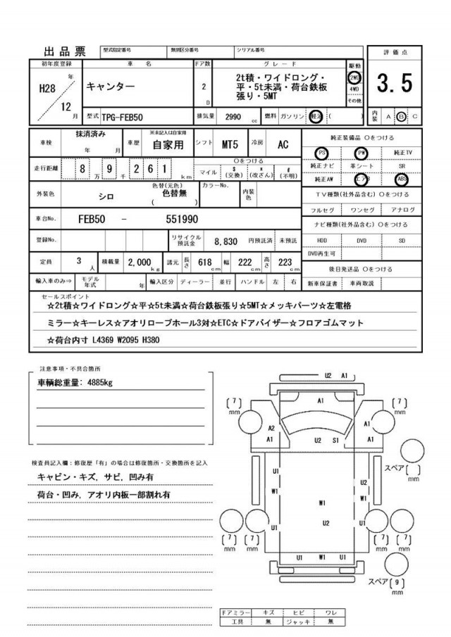 ☆2t積☆ワイドロング☆平☆5t未満☆荷台鉄板張り☆5MT☆メッキパーツ☆左電格ミラー☆キーレス☆アオリロープホール3対☆ETC☆ドアバイザー☆フロアゴムマット☆荷台内寸 L4369 W2095 H380