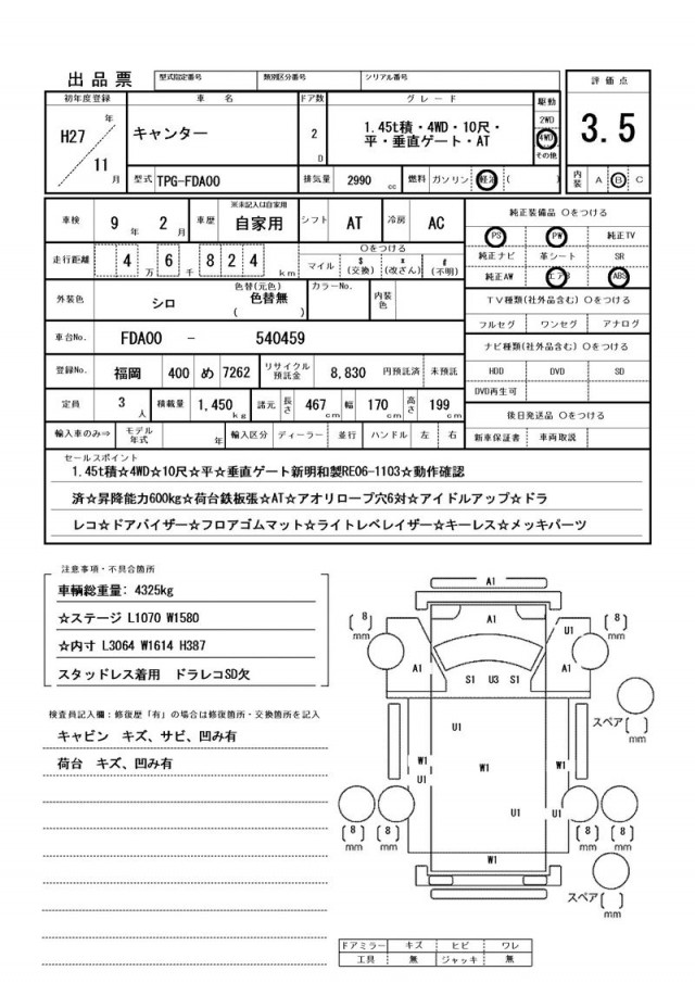 1.45t積☆4WD☆10尺☆平☆垂直ゲート新明和製RE06-1103☆動作確認済☆昇降能力600㎏☆荷台鉄板張☆AT☆アオリロープ穴6対☆アイドルアップ☆ドラレコ☆ドアバイザー☆フロアゴムマット☆ライトレベレイザー☆キーレス☆メッキパーツ キャビン キズ、サビ、凹み有・荷台 キズ、凹み有・スタッドレス着用・ドラレコSD欠 ☆ステージ L1070 W1580☆内寸 L3064 W1614 H387