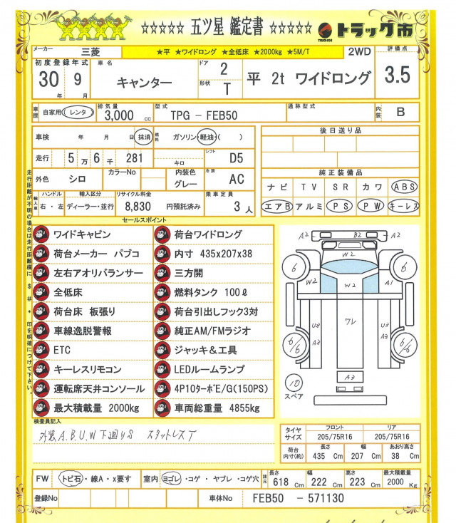 ワイドロング平ボディ☆全低床/3方開☆荷台床板張り☆左右アオリバランサー☆荷台引き出しフック3対☆車線逸脱警報☆キーレス/ETC☆運転席天井コンソール☆LEDルームランプ☆5MT