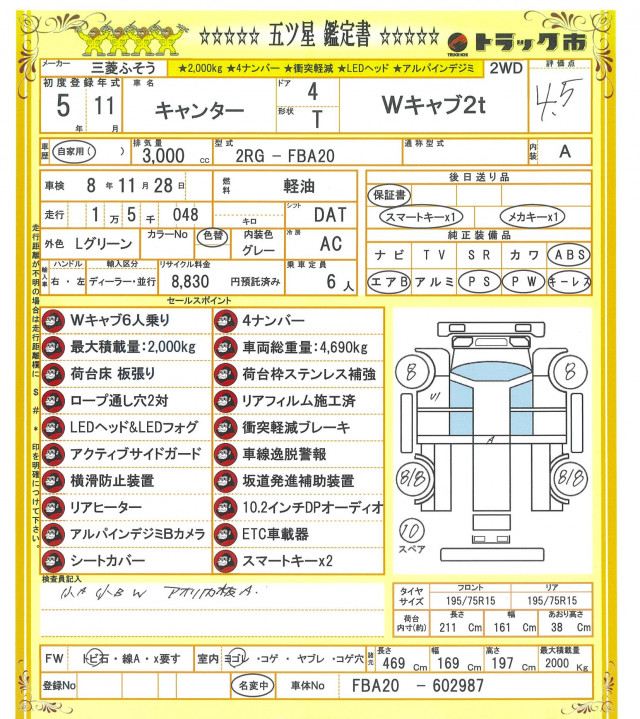 ☆Wキャブ☆6人乗☆4ナンバー☆荷台床板張り☆荷台枠ステンレス補強☆ロープ通し穴2対☆リアフィルム施工済☆LEDヘッド&LEDフォグ☆衝突軽減ブレーキ☆アクティブサイドガード☆車線逸脱警報☆横滑防止装置☆坂道発進補助装置☆リアヒーター☆10.2インチDPオーディオ☆アルパインデジミBカメラ☆ETC☆シートカバー☆スマートキー☆2000kg