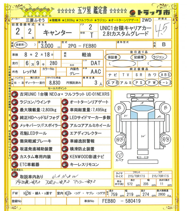 ☆古河ユニック1台積NEOα+フルフラット☆ラジコン/ウインチ☆オートターンリアゲート☆純正HIDヘッド&Fフォグ☆LEDサイドマーカー☆メッキパーツ/Fスポイラー☆アルコアアルミホイール☆花魁LEDテール☆エアディフレクター☆衝突軽減ブレーキ☆車線逸脱警報☆坂道発進補助装置☆横滑防止装置☆カスタム専用内装☆KENWOOD彩速ナビ☆ETC☆キーレス