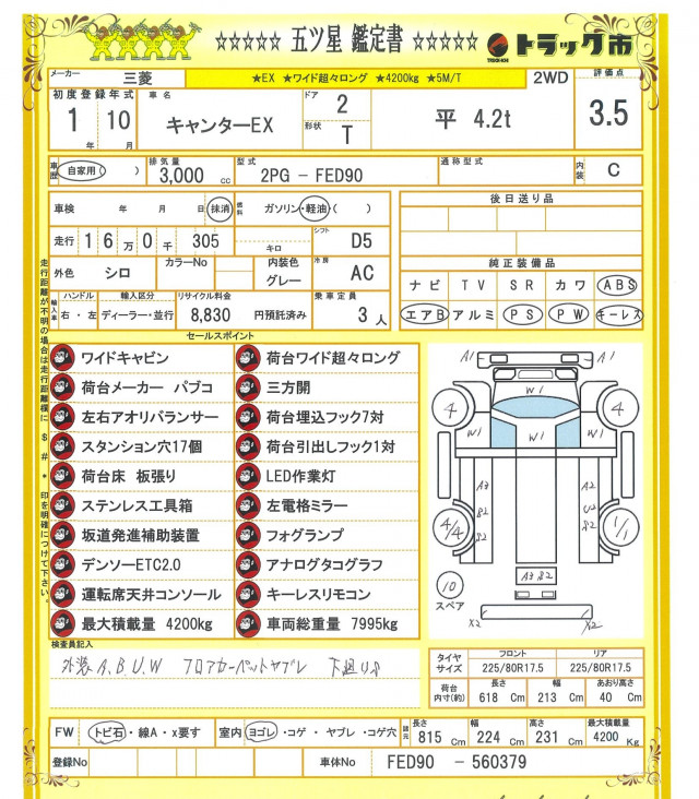 4.2トン EX 平ボディー ワイドキャビン 荷台ワイド超々ロング 荷台メーカー:パブコ 3方開 左右アオリバランサー 荷台埋込フック7対 スタンション穴17個 荷台引出しフック1対 荷台床板張り LED作業灯 坂道発進補助装置 ETC2.0 キーレス タコグラフ ステンレス工具箱 左電格ミラー フォグランプ 運転席天井コンソール 4200kg 3人乗 5MT