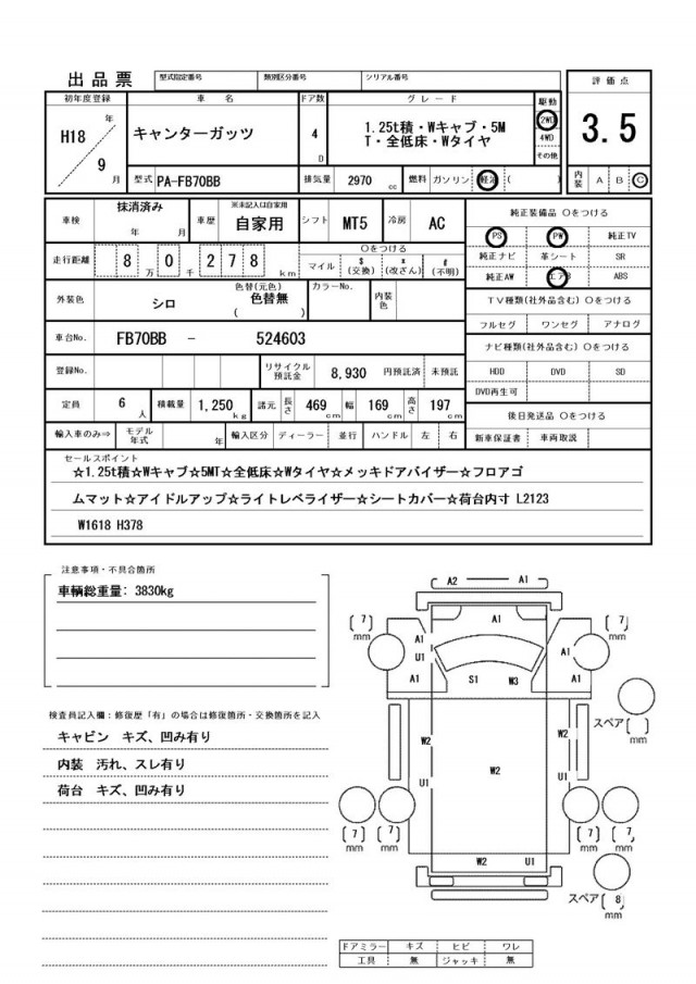 キャビン キズ、凹み有り・内装 汚れ、スレ有り・荷台 キズ、凹み有り