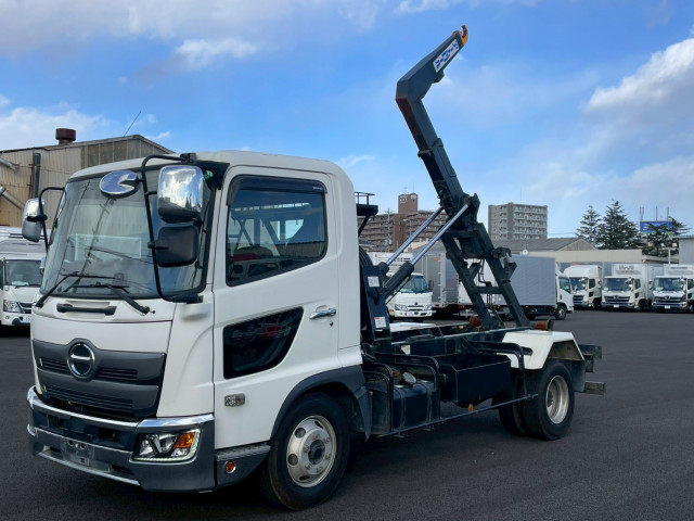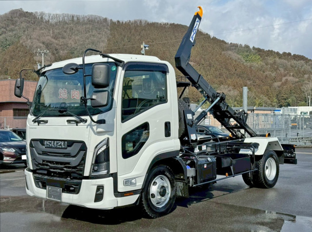 ★令和7年式/三菱ふそう/ファイター/脱着式コンテナ専用車 ★標準幅/ベッドレス/3.4トン積載/リーフサス/220馬力 ★登録済未使用車/6速MT車/カラーバックカメラ・モニタ付 ★極東開発工業製/ハイパースイングフックロール/ラジコン付 ★ツインホイスト/フックチルト機能/キャブバックステップ ★社外品コンテナ付/強化仕様/リヤ観音式扉/容積約8.2m3