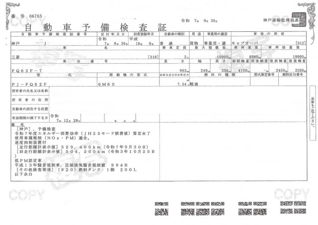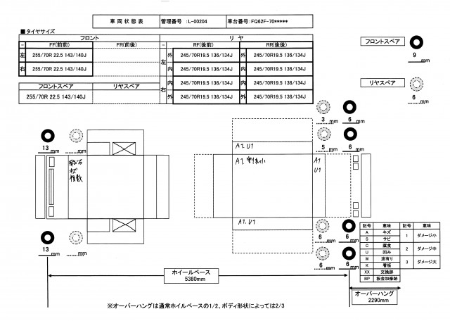 ▲フロントガラス:飛び石キズ複数▲キャビン外装:キズ小、樹脂パーツ日焼け▲キャビン内装:スリキズ、電装品取外し跡、ハンドルスレ▲運転席シート:ヘタリ、座席表面にスレ・破れ小▲パワーウインドウ:モーター弱い▲シガーライター:欠品▲エンジン:ブレ小、オイル汚れ小▲シャーシ・下回り:サビ小、サビ跡▲マフラー:サビ▲エアドライヤー:オイル汚れ▲後輪タイヤ:トレッドゴムちぎれ※他、詳細はお問い合わせください