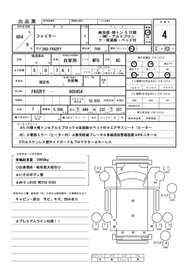 ☆5.2t積☆増トン☆アルミブロック☆床縞板☆ベッド付☆エアサスシート(ヒーター付)☆電格ミラー(ヒーター付)☆衝突軽減ブレーキ☆車線逸脱警報装置☆Bモニター☆ETC☆ステンレス製サイドガード&プロテクター☆キーレス ☆いそのボディ製☆内寸 L6102 W2210 H183 ☆プレミアムライン仕様!! キャビン・荷台 サビ、キズ、凹み有り