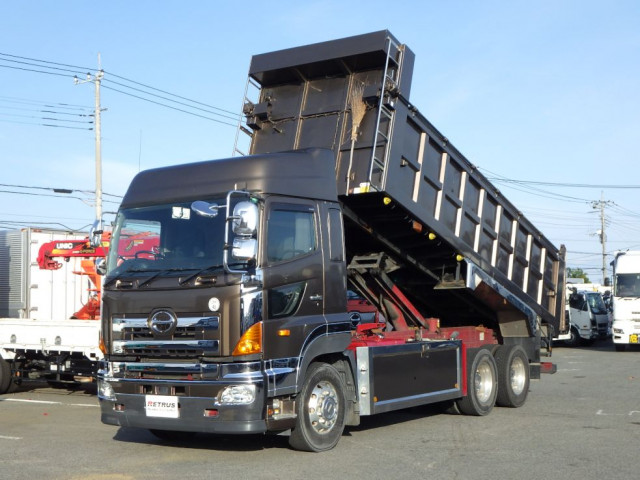 未使用・シフトパイロット・新明和製の22t土砂禁ダンプです。 ボディ内寸はL=6.50m W=2.20m H=1.60mで積載は9,800kgとなっております 上物の立米数は約23立米、後扉は片開きとなっております。 材質は耐摩耗性鋼板で厚みは床・ゲート・前壁・サイド共にALL4.5mmです! キャブ周りメッキ仕様、アルミホイール、工具箱・フェンダーはステン製と整った車輛です!