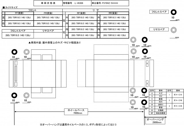 ▲車両外装:屋外保管によるキズ・サビ小程度有り ▲フロントガラス:飛び石キズ小 ▲メッキコーナーパネル:飛び石キズ小 ▲シャーシ・下回り:サビ小