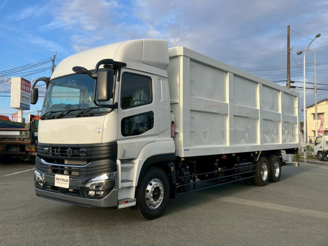 三菱新型・未使用・25t高床2デフ、エアサスのムービングフロアが入庫いたしました。(標準ルーフ) ボディは新明和製でL=9.50m W=2.30m H=2.40m、約52.4立米で積載10,600kg、シートデッキ付です。 キャブにはメッキパーツ装着、アルミホイール付と見た目にも拘っております! また後輪エアサスの車輌ですので、荷物にも優しい仕様となっております! 新車オーダーすると、とても長い納期がかかる車輛です! お急ぎの方はお早めにお問い合わせ下さい。