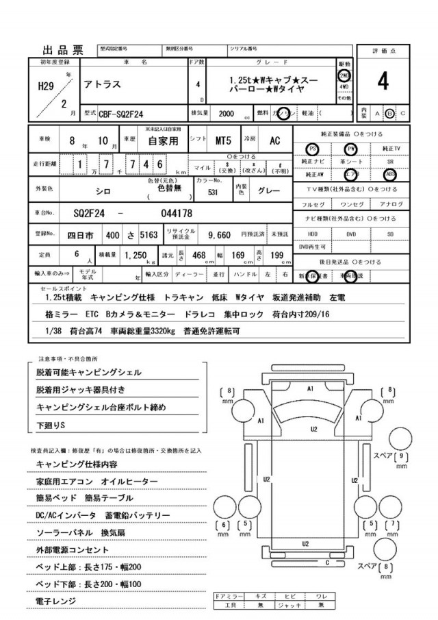脱着可能キャンピングシェル 脱着用ジャッキ器具付き キャンピングシェル台座ボルト締め 下廻りS キャンピング仕様内容:家庭用エアコン オイルヒーター 簡易ベッド 簡易テーブル DC/ACインバータ 蓄電鉛バッテリー ソーラーパネル 換気扇 外部電源コンセント ベッド上部:長さ175・幅200 ベッド下部:長さ200・幅100 電子レンジ