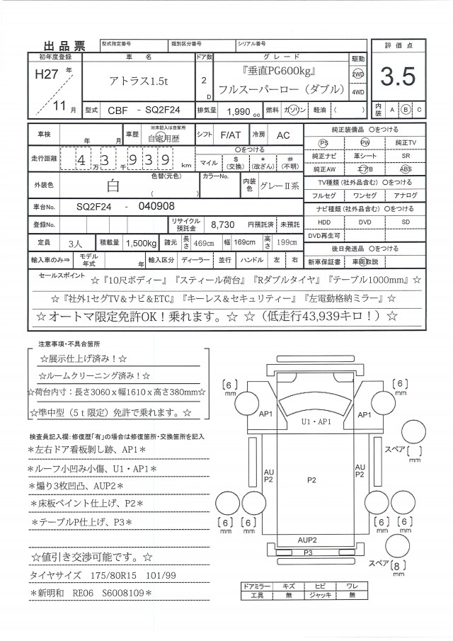 ☆H27年アトラス1.5tフルスーパーロー(ダブル)『垂直PG600kg・テーブル1000mm』スティール荷台・10尺ボディー☆(低走行43,939キロ!)『社外1セグTV&ナビ&ETC!』『キーレス&セキュリティー』『左電動格納ミラー』☆準中型(5t限定)免許で乗れます。☆オートマ限定免許OK!乗れます。☆遠方の方でも安心!ルームクリーニング済み!☆展示仕上げ済み!☆