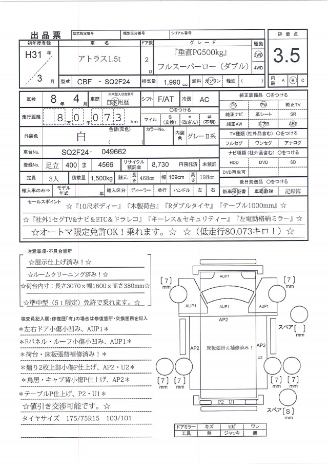 ☆H31年アトラス1.5tフルスーパーロー(ダブル)『垂直PG500kg・テーブル1000mm』木製荷台・10尺ボディー(低走行80,073キロ!)☆『社外1セグTV&ナビ&ETC&ドラレコ』『キーレス&セキュリティー』『左電動格納ミラー』☆準中型(5t限定)免許で乗れます。☆オートマ限定免許OK!乗れます。☆遠方の方でも安心!ルームクリーニング済み!☆展示仕上げ済み!☆