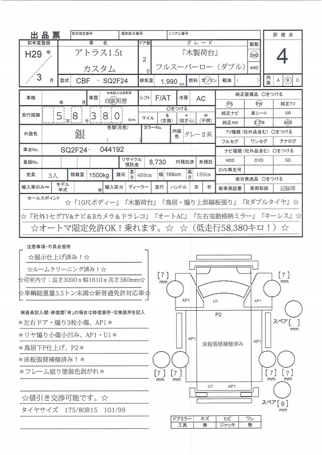 ☆H29年アトラス1.5tフルスーパーロー(ダブル)『カスタム』木製荷台・10尺ボディー(低走行58,380キロ!)☆『鳥居・煽り上部縞板張り』『オートAC』『左右電動格納リモコンミラー&ヒーター』『社外1セグTV&ナビ&Bカメラ&ETC&ドラレコ』『キーレス&セキュリティー』☆車輌総重量3.5トン未満☆新普通免許対応車☆オートマ限定免許OK!乗れます。☆