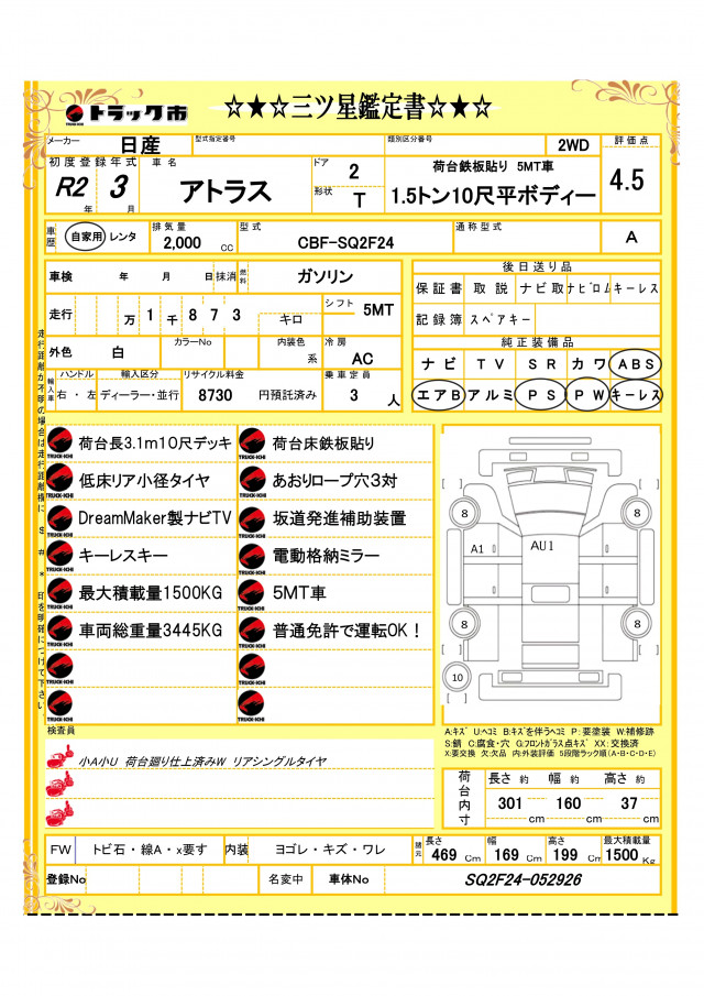 1.5トン10尺平ボディー 荷台床鉄板貼り 低床リア小径タイヤ あおりロープ穴3対 ナビTV キーレス 5MT 普通免許で運転OK