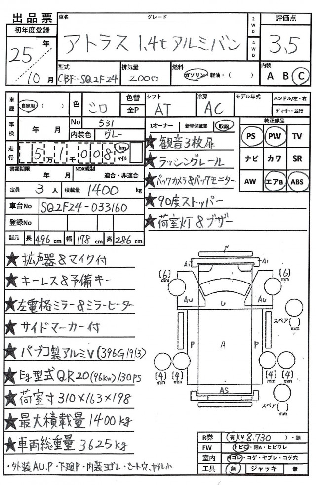 観音3枚扉 ラッシングレール バックカメラ&バックモニター 90度ストッパー 荷室灯&ブザー 拡声器&マイク付 キーレス&予備キー 左電格ミラー&ミラーヒーター パブコ製アルミV(396G1913) Eg型式QR20 130ps 荷室寸310-163-198 最大積載量1400キロ 車両総重量3625キロ