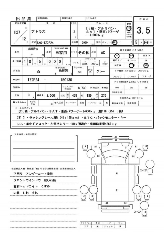 【2t積・アルミバン・SAT・垂直パワーゲート600kg[縦116(95):横178]】・ラッシングレール2段(45:165cm)・ETC・バックモニター・キーレス・集中ドアロック・左電格ミラー・NOxPM適合・車両総重量4865kg