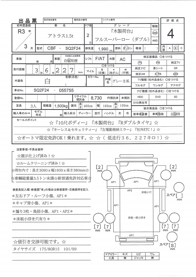 ☆R3年アトラス1.5tフルスーパーロー(ダブル)木製荷台・10尺ボディー☆(低走行36,227キロ!)『キーレス&セキュリティー』『左電動格納ミラー』『チルトキャブ』『社外ETC!』☆車輌総重量3.5トン未満☆新普通免許対応車☆オートマ限定免許OK!乗れます。☆遠方の方でも安心!ルームクリーニング済み!☆展示仕上げ済み!☆