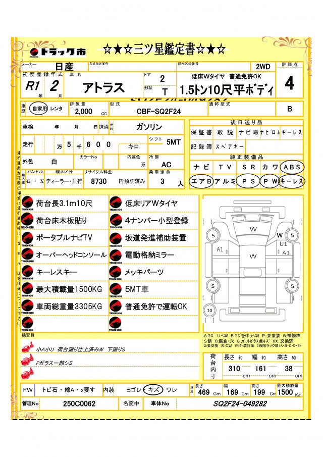 1.5トン10尺平ボディー 低床リアWタイヤ ナビTV 坂道発進補助装置 キーレスキー 5MT