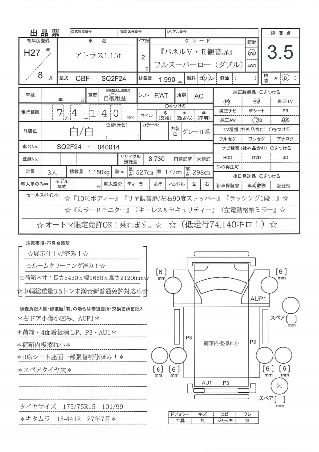 ☆H27年アトラス1.15tフルスーパーロー(ダブル)『パネルV・R観音扉・ラッシング1段』10尺ボディー(低走行74,140キロ!)『左右90度ストッパー』『カラーBモニター』『キーレス&セキュリティー』『左電動格納ミラー』☆車輌総重量3.5トン未満☆新普通免許対応車☆オートマ限定免許OK!乗れます。☆遠方の方でも安心!ルームクリーニング済み!☆展示仕上げ済み!☆