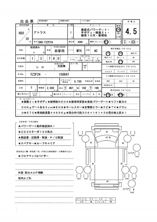 ★積載2t★平ボディ★新明和RE06★新車時架装★垂直パワーゲート★リフト能力600Kgゲート長83cm★EHS★キーレスキー★左電格ミラー★ナビ★TV★ドラレコ★ETC★車両総重量4465Kg★荷台内寸約306×161×38荷台地上高81