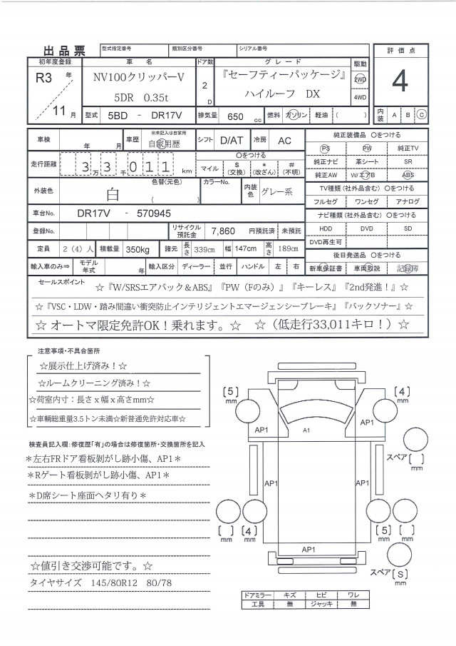 ☆R3年NV100クリッパーV・5DR・ハイルーフ・『セーフティーパッケージ』DX(2/4人乗り!)☆(低走行33,011キロ)☆『オートギアシフトAT/2nd発進付!』『VSC・LDW・踏み間違い衝突防止インテリジェントエマージェンシーブレーキ』『バックソナー』『キーレス』『W/SRSエアバック&ABS』『PW(Fの小見)』『社外ドラレコ』☆オートマ限定免許OK!乗れます。☆