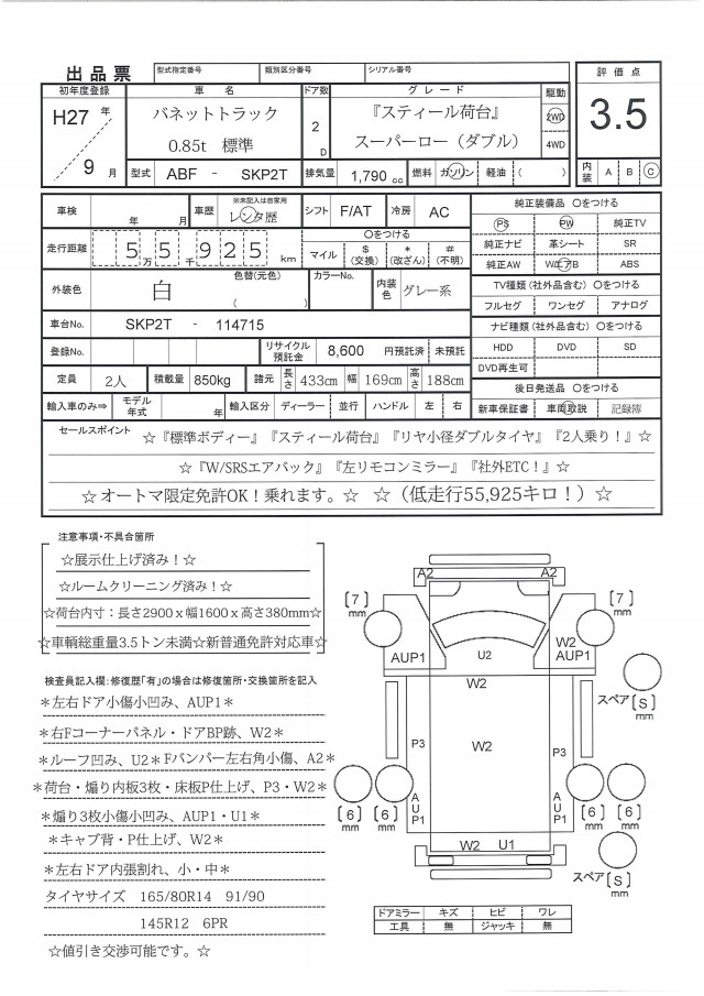 ☆H27年バネットトラック0.85t『標準』スーパーロー(ダブル)スティール荷台・2人乗り!☆(低走行55,925キロ!)『W/SRSエアバック』『左リモコンミラー』『社外ETC!』☆車輌総重量3.5トン未満☆新普通免許対応車☆オートマ限定免許OK!乗れます。☆遠方の方でも安心!ルームクリーニング済み!☆展示仕上げ済み!☆