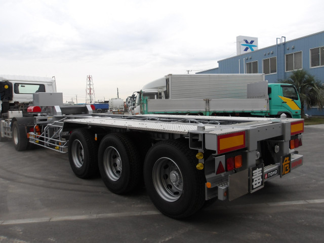 3軸20Fコンテナセミトレーラー、未使用車です♪東邦製です♪最大積載量28200㎏予定!タンクコンテナ仕様の3軸トレーラーです♪リフトアクスルも搭載されております♪是非お問い合わせください♪ 20ftコンテナ 危険物仕様 エアサス リフトアップ(前2軸リフト) カウンターウエイト 凍結防止ヒーター ツイストロック部スペーサー板厚12mm フェンダーアルミ縞板