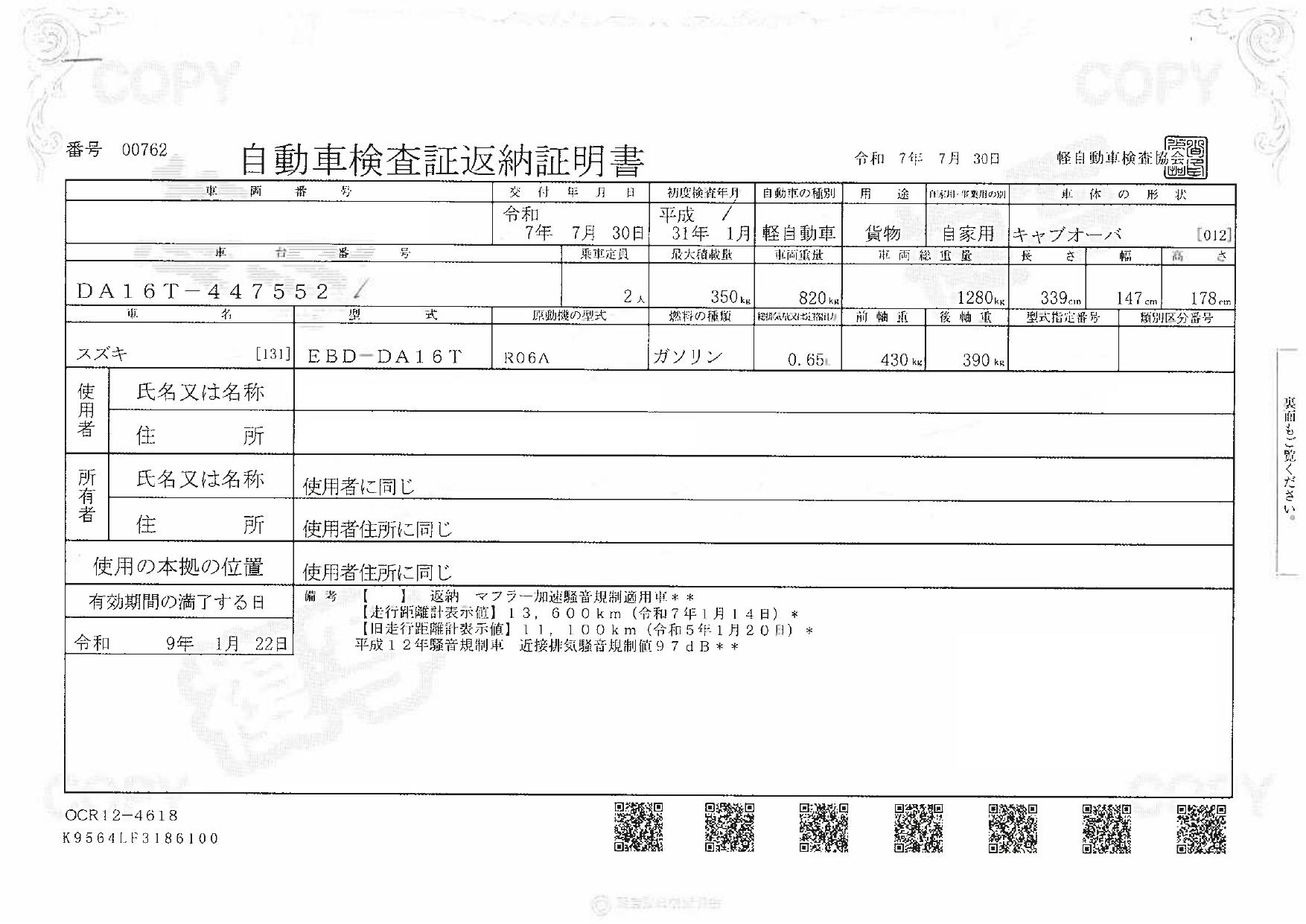 | 車検 | 抹消 |