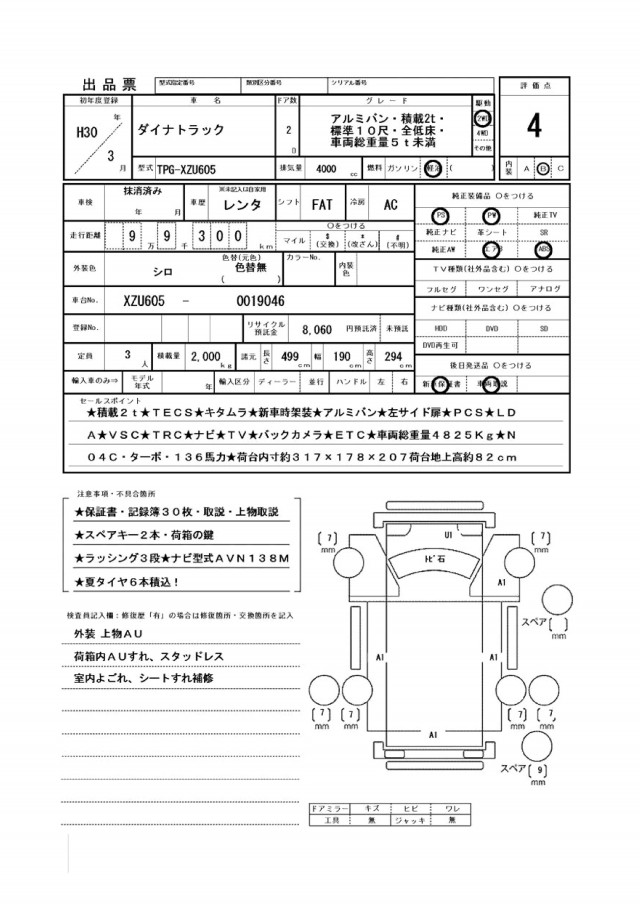 ★積載2t★TECS★キタムラ★新車時架装★アルミバン★左サイド扉★PCS★LDA★VSC★TRC★ナビ★TV★バックカメラ★ETC★車両総重量4825Kg★N04C・ターボ・136馬力★荷台内寸約317×178×207荷台地上高約82cm★保証書・記録簿30枚・取説・上物取説★スペアキー2本・荷箱の鍵★ラッシング3段★ナビ型式AVN138M★夏タイヤ6本積込!
