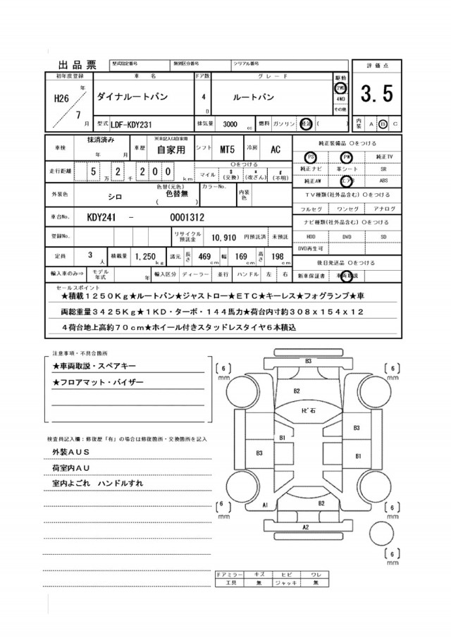 ★積載1250Kg★ルートバン★ジャストロー★ETC★キーレス★フォグランプ★車両総重量3425Kg★1KD・ターボ・144馬力★荷台内寸約308x154x124荷台地上高約70cm★ホイール付きスタッドレスタイヤ6本積込★車両取説・スペアキー★フロアマット・バイザー
