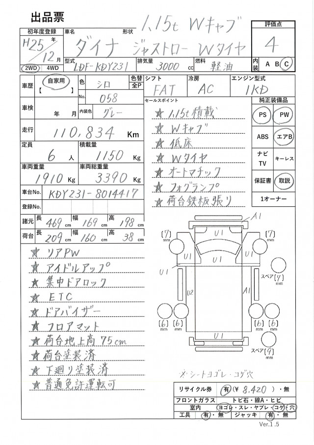 価格には保険料、税金(車両本体の消費税除)、リサイクル料金、リサイクル預託金相当額、登録、納車、陸送等に伴う費用等は含まれておりません。