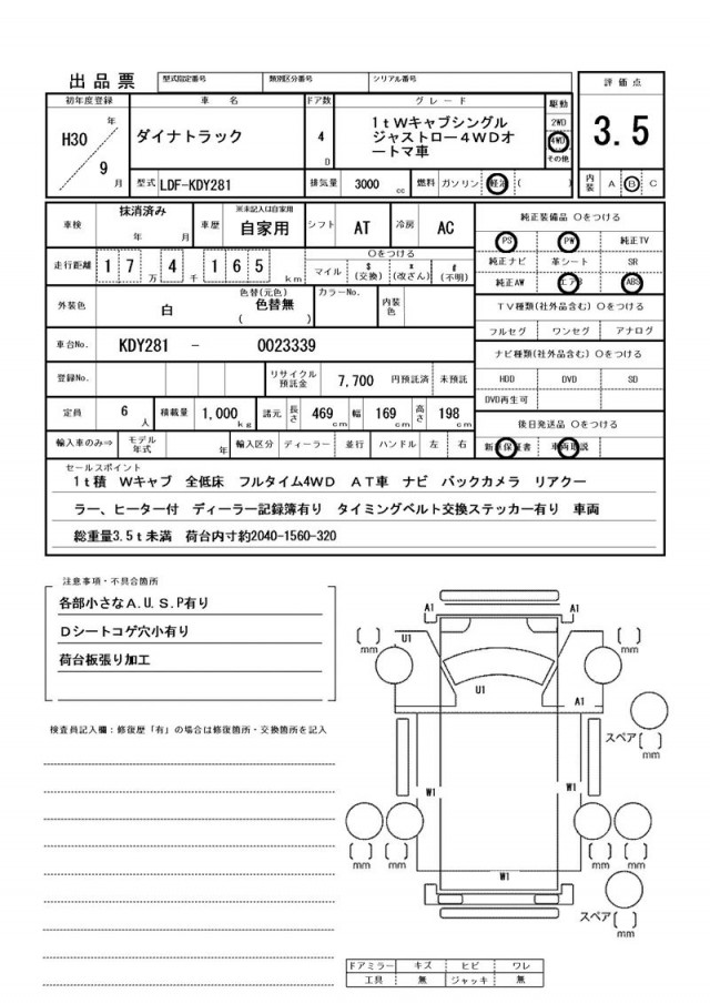 1t積 Wキャブ 全低床 フルタイム4WD オートマ車 ナビ バックカメラ リアクーラー、ヒーター付 ディーラー記録簿有り タイミングベルト交換ステッカー有り 車両総重量3.5t未満