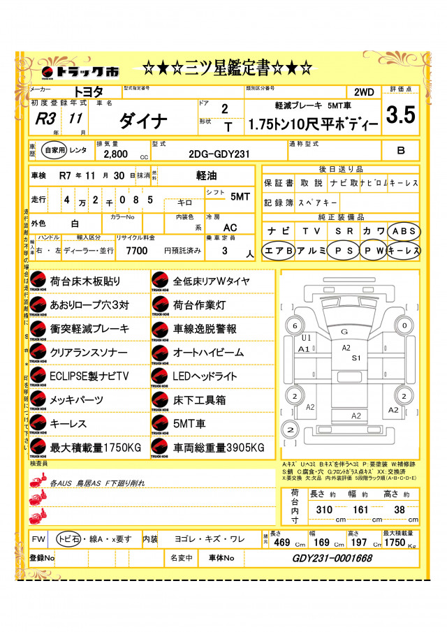 1.75トン10尺平ボディー 荷台床木板貼り ロープ穴3対 衝突軽減ブレーキ 車線逸脱警報 クリアランスソナー ナビTV LEDヘッドライト キーレス 5MT