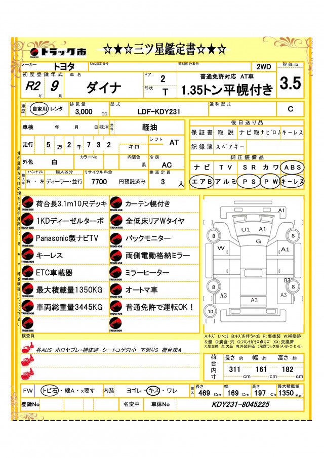 1.35トン10尺平ボディー 荷台カーテン幌付き 1KDディーゼルターボ 全低床リアWタイヤ ナビTV バックモニター ETC キーレス AT車