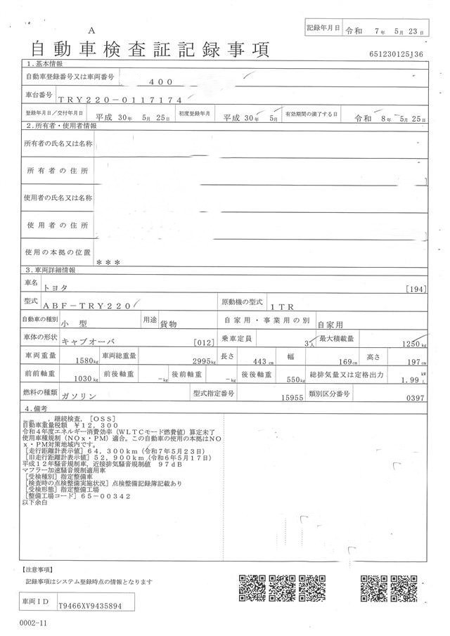 荷台内寸284×160×38 車両外寸443×169×197 車両総重量3.5t未満 新普通免許 4ナンバー エンジン型式1TR 2000cc 保証付 小型 トラック