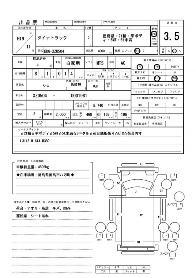 荷台・アオリ・鳥居 キズ、凹み・運転席 シート破れ