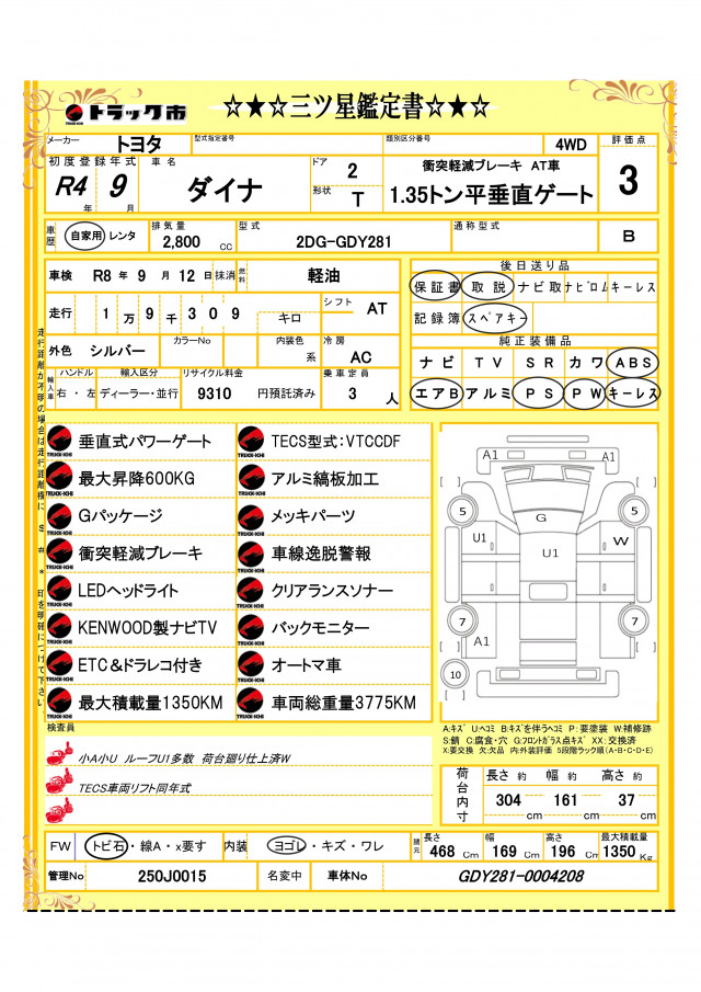 1.35トン10尺平ボディー 4WD Gパッケージ 600KG垂直式パワーゲート 荷台床木板貼り 衝突軽減ブレーキ 車線逸脱警報 ナビTV バックモニター ETC メッキパーツ AT車
