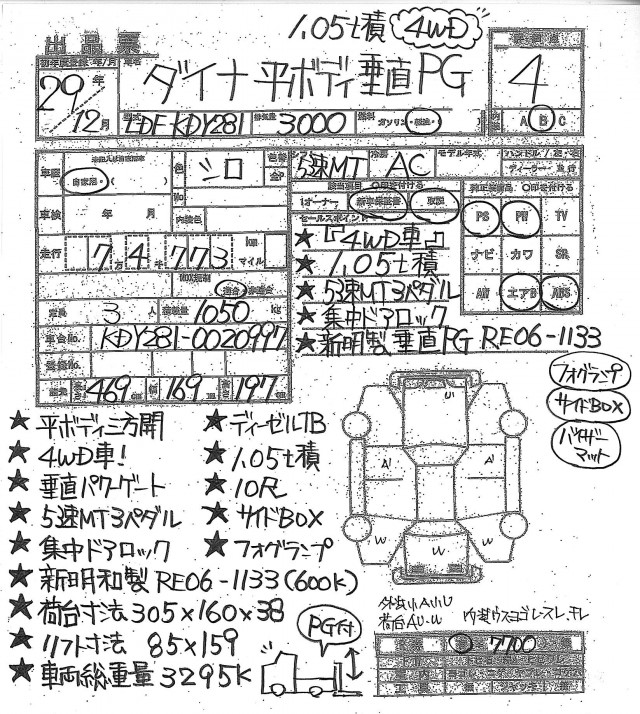 ★垂直パワーゲート ★4WD車 ★1.05トン積 ★5速MT3ペダル ★集中ドアロック ★フォグランプ ★サイドBOX ★バイザーマット ★新明和製PG RE06-1133 600K ★荷台寸法305-160-38 ★リフト85-159