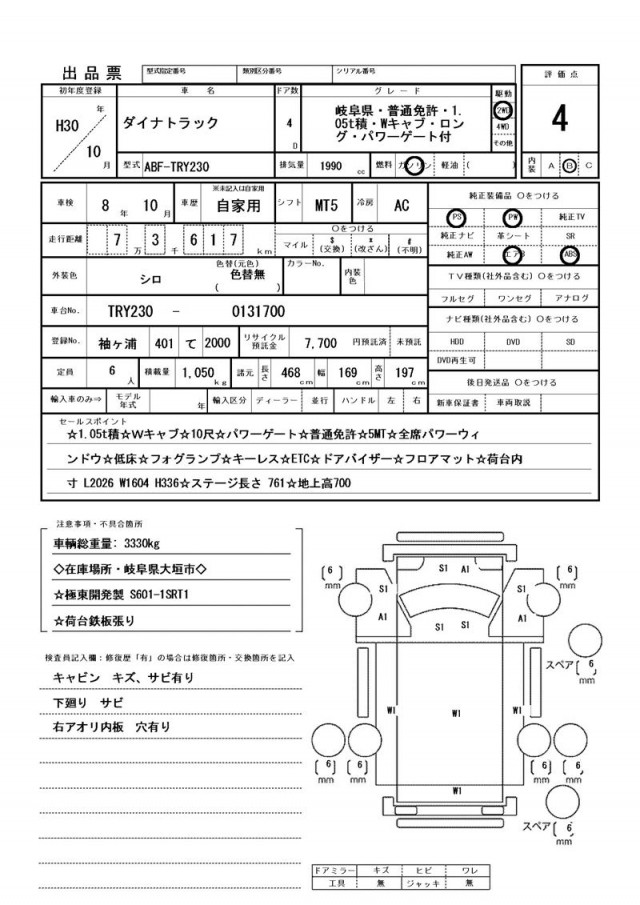 キャビン キズ、サビ有り・下廻り サビ・右アオリ内板 穴有り