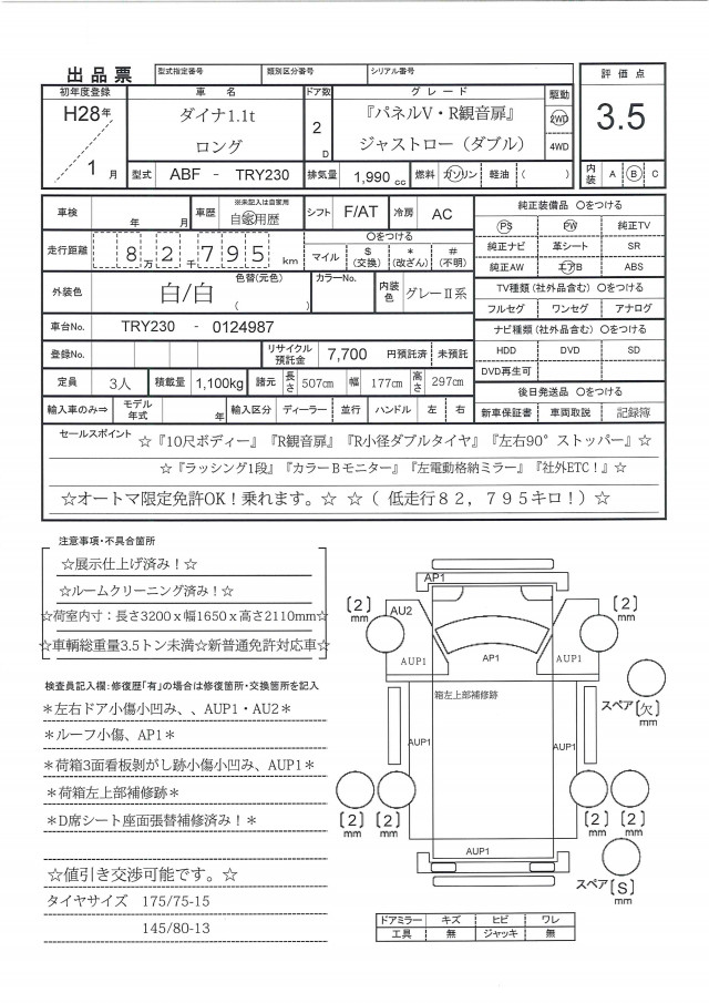 ☆H28年ダイナ1.1t『ロング』ジャストロー(ダブル)『パネルV・R観音扉』左右90°ストッパー・ラッシング1段☆(低走行82,795キロ!)『SRSエアバック』『左電動格納ミラー』『カラーBモニター』☆車輌総重量3.5トン未満☆新普通免許対応車☆オートマ限定免許OK!乗れます。☆遠方の方でも安心!ルームクリーニング済み!☆展示仕上げ済み!☆