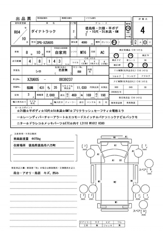 ☆2t積☆平ボディ☆10尺☆5t未満☆6MT☆プリクラッシュセーフティ☆電格ミラー☆レーンディパーチャーアラート☆エコモードスイッチ☆パナソニックナビ☆バックモニター☆ドラレコ☆メッキパーツ☆ETC☆内寸 L3110 W1612 H380