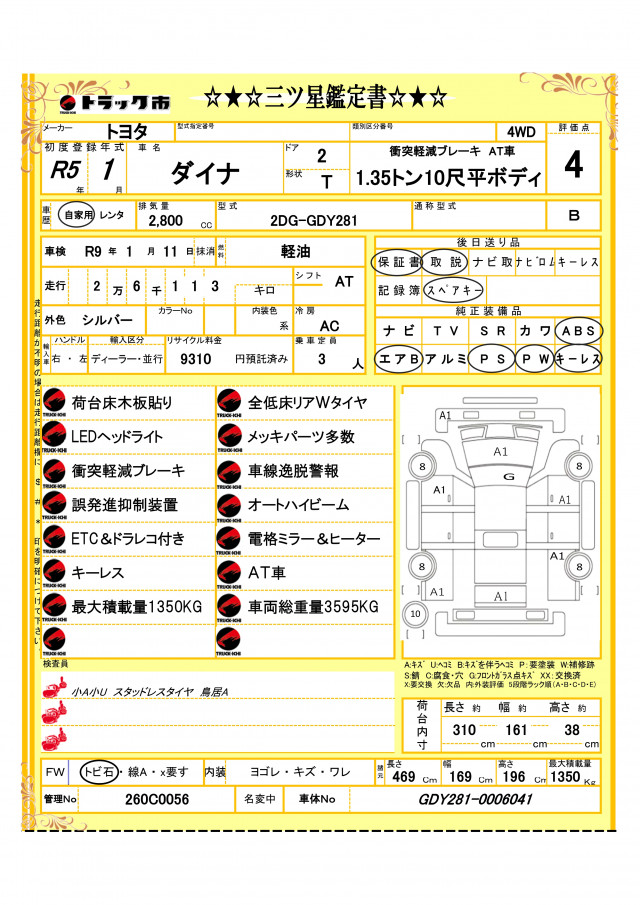 1.35トン10尺平ボディー4WD 荷台床木板貼り 衝突軽減ブレーキ 誤発進抑制装置 ETC&ドラレコ付き キーレス LEDヘッドライト AT車