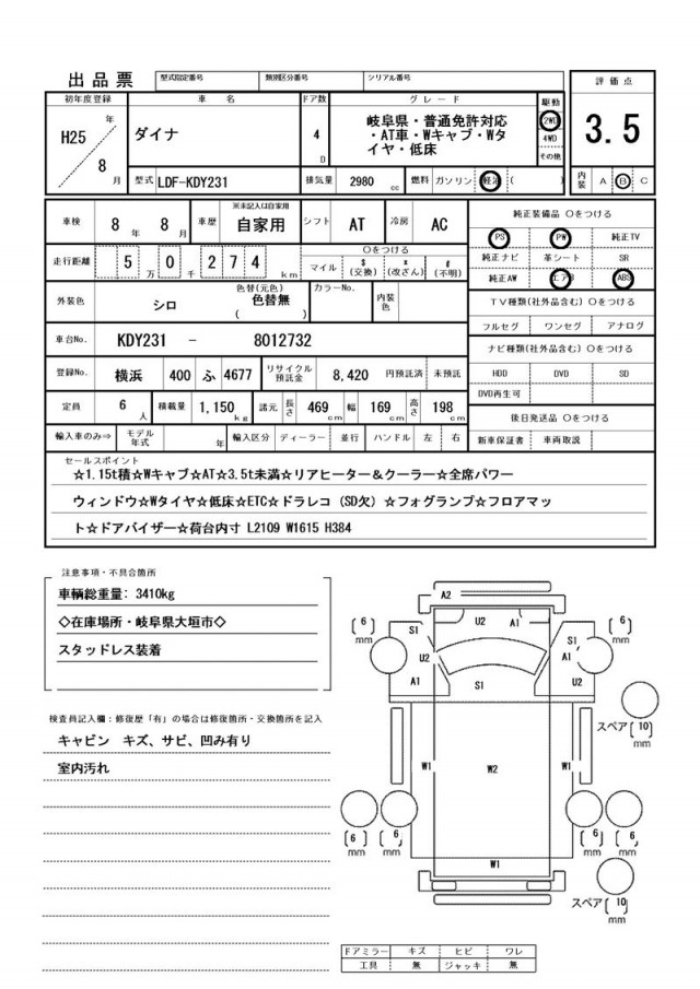 スタッドレス装着・キャビン キズ、サビ、凹み有り・室内汚れ