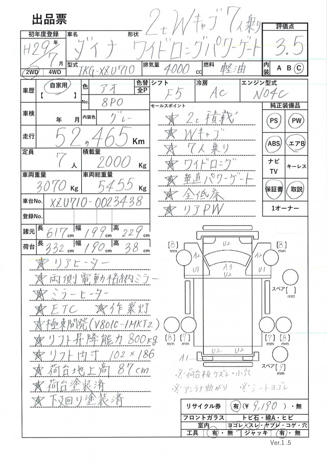2t積載 Wキャブ ワイドロング PG 垂直式 7人乗り 全低床 リアPW リアヒーター 電格ミラー ETC 作業灯 極東開発 リフト能力800kg リフト内寸102/186 荷台内寸332/190/38 荷台高87 車両総重量5455kg