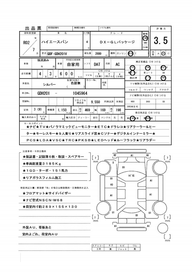 ★ナビ★TV★パノラマミックビューモニター★ETC★ドラレコ★リアクーラー&ヒーター★キーレスキー★9人乗り★リアスライド窓★Cソナー★デジタルインナーミラー★PCS★LDA★VSC★TRC★PKSB★LEDヘッド★ルーフラック★リアラダー★保証書・記録簿6枚・取説・スペアキー★車両総重量3185Kg★1GD・ターボ・151馬力★リアガラスフィルム施工★ナビ型式NSCN-W68