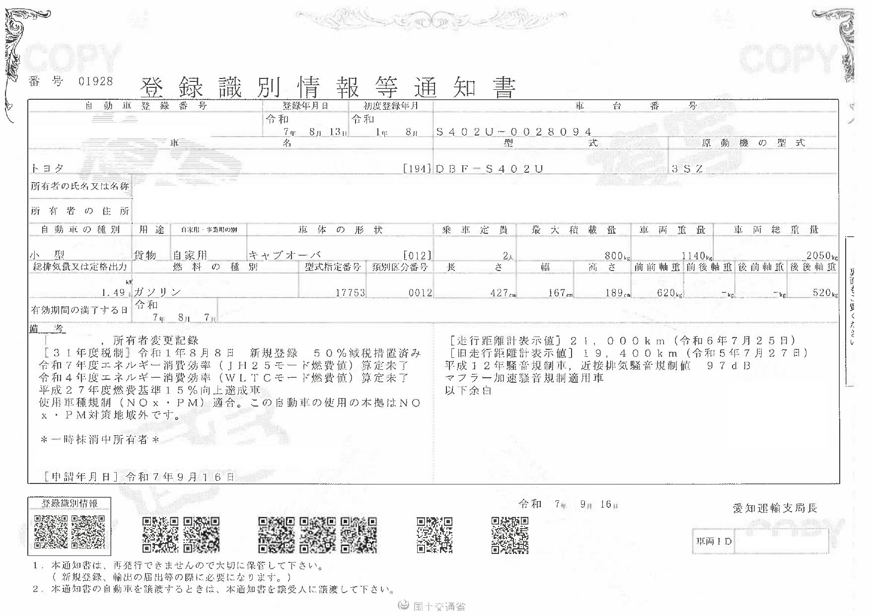 | 車検 | 抹消 |